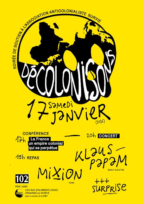 La soirée est organisée par Survie, avec le soutien de la CNT.